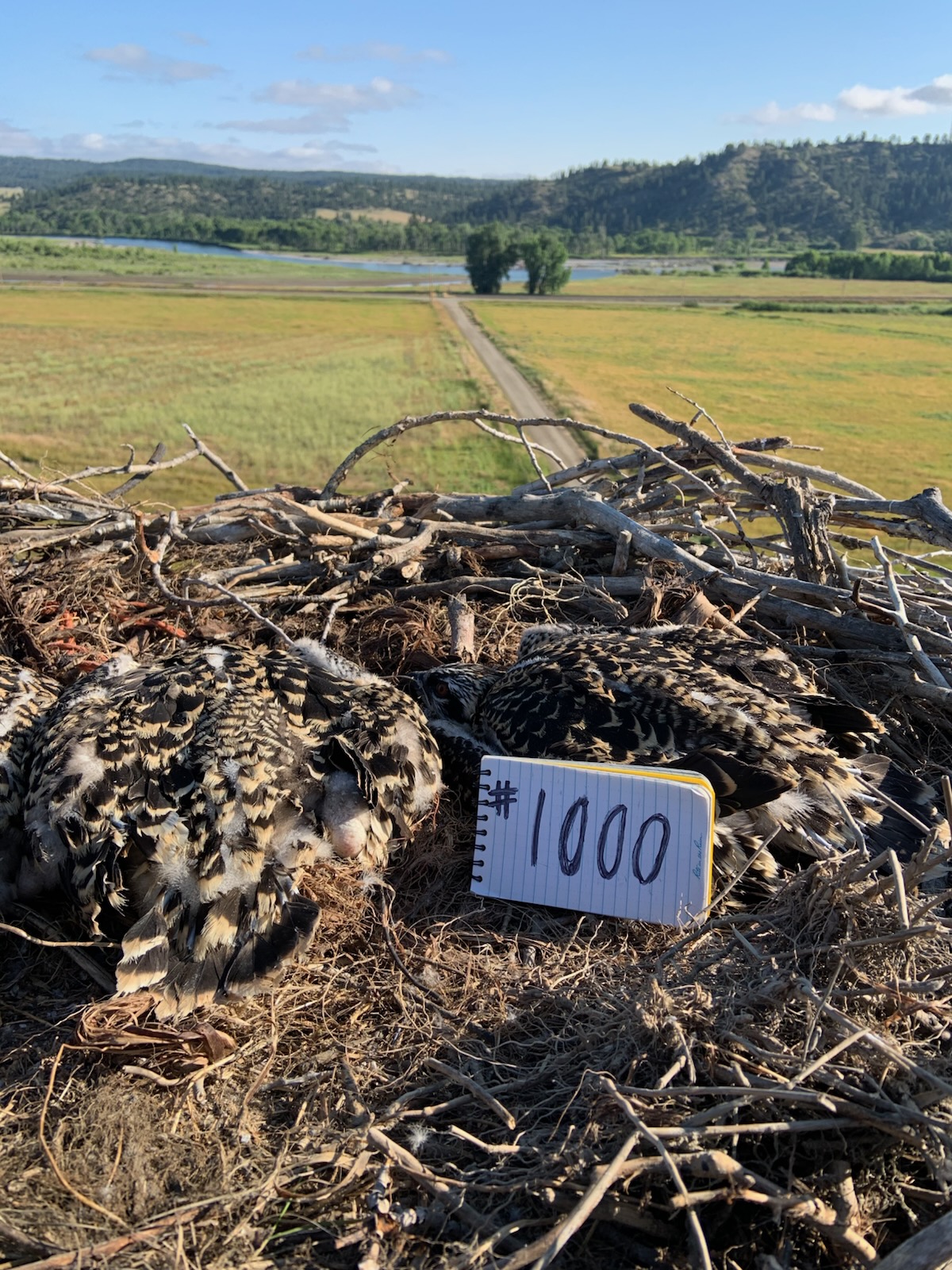 In 2025, the 1,000th nestling was banded with the Yellowtone River’s assigned green band. On average, 11% of each year’s fledglings will survive to breed with most nesting along the Yellowstone River or other Montana rivers. Numerous sightings of these Yellowstone River Ospreys have been received from observers along the Gulf Coast and in Central America.